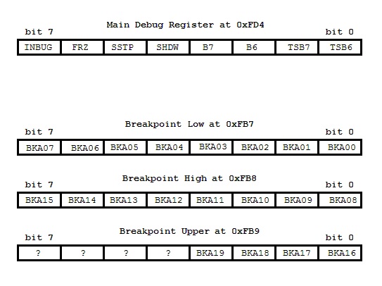 The Debug hardware inside PIC18F chips consists of 4 undocumented SFRs. (See the figure below.) The main Debug register is located at address 0xFD4. If you look in the data sheet for any of the PIC18F chips, you will see that 0xFD4 is shown as not-implemented. It is really there, though, just the same. If the prerequisite conditions described above are met and the Debug Vector has been setup with an appropriate Goto command, when any of the triggering events occurs, control will transfer to the address indicated by the Goto command in the Debug Vector and the INBUG bit (bit 7) of the main Debug register will be set to 1.