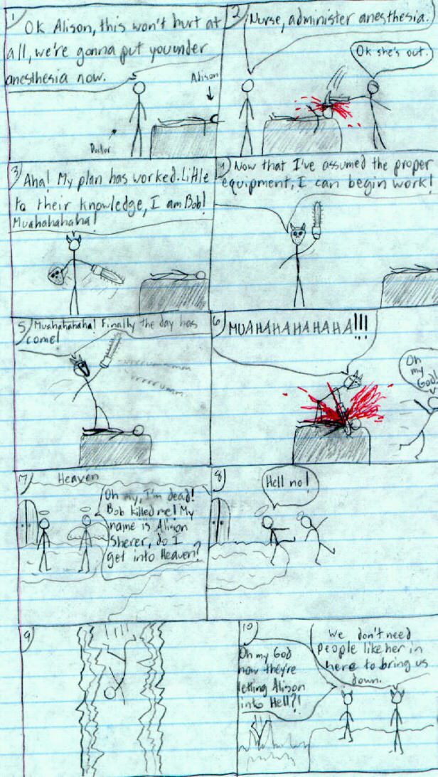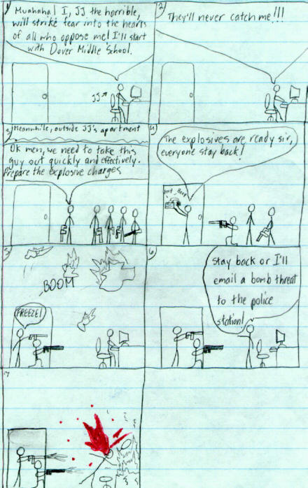 I draw stick comics. Simple, funny, a laugh riot for the whole family. May contain inside jokes. If you don't get them or think they're funny, I don't care. Some of these are hard to read and on some that are double pages,the red ink bled through the paper so sorry about that. More comics to come. Enjoy.
