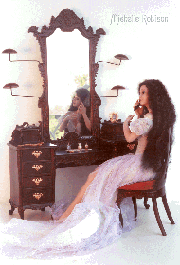 a Boulder opal, she brushes her silk and mohair wig with a tiny hair brush