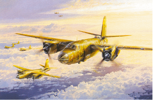 The B-26 Marauder was a twin-engined medium bomber with a streamlined fuselage of circular cross-section and a relatively small shoulder wing. It was difficult to handle, because of its high wing loading, but it also gave high performance. It started life with high accident rates due to it's high technical demands placed on the pilots. It was known to be a "hot" aircraft with a relatively fast landing speed around 152 mph. If an inexperienced pilot, and most trainees were, brought it in too slow it would stall and spin with little room to recover. With proper pilot training it later proved to be a safe and effective aircraft. Many crews grew to appreciate it's agility and strong defensive armament. With the B-25 Mitchell it formed the US medium bomber forces in WWII. These flew mainly daylight raids, called Ramrods, against such targets as railroad stations, coastal gun batteries, important factories, and bridges. There were 4863 built.