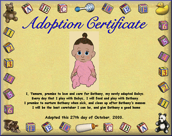 Amanda’s Babyz Hang Out Adoption Certificate