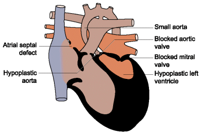a combination of heart defects that mainly affect the left side of the heart.The main pumping chamber(left ventricle)is very small & the mitral and/or aortic valves may be narrow,blocked or not formed at all. The Aorta is small & not fully formed & there is a hole(atrial septal defect)between the two collecting chambers.We are told this affects about 2500 babies a year & is one of the most severe heart defects..