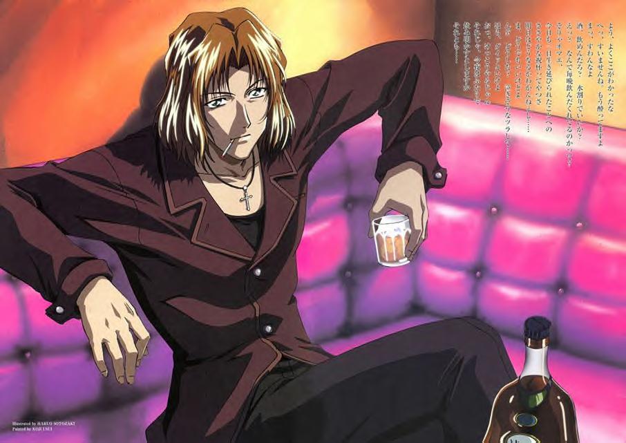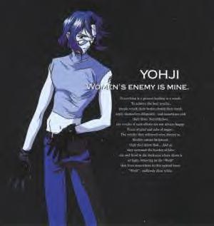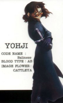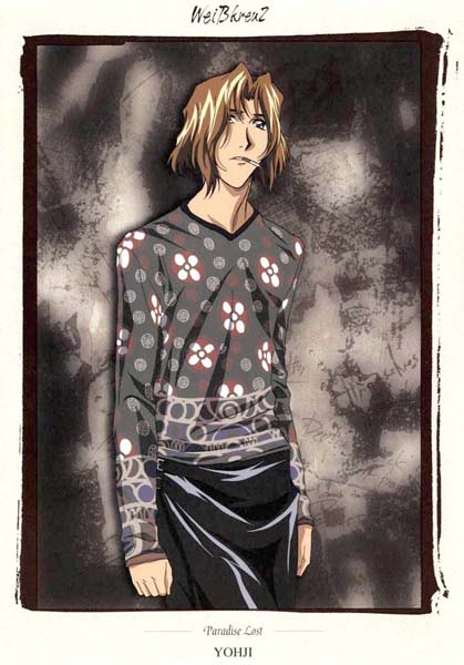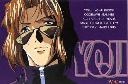 Yohji Kodou Foppish and affected, a matchless playboy. He boasts that there's no woman who won't give in to him. He's kind to women and severe with men. He's sure to take any mission that has to do with women. As anyone could plainly see, Yohji is my favorite character of Weiss Kreuz. But, of course I believe that playboy attitude is just a facade, sort of like drugs it gets his mind off of things. He blames himself for the death of his old partner Asuka and as he once almost loved her, he now almost hates her for the torment he's going through now. He's a very emotional person but he tries his best to hide it although from time to time it comes out. Yohji is a comical character and very fun to watch but when he gets serious, look out!