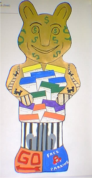 This is a project I worked on for Wright State University in Fairborn Ohio to help raise funds for various student organizations. There were several groups and each one had an artistic advisor to help design a pre-fabricated statue of the school's mascot. I volunteered my time working with the American Humanics, a national alliance of colleges, universities, and non-profit organizations that prepare undergraduates for careers with youth and human service agencies. They came up with the idea for a Monopoly theme, and I designed it for them. Everyone from the group, including myself, painted the statue. We called it Charity Raider, and it sold for $500 at auction.
