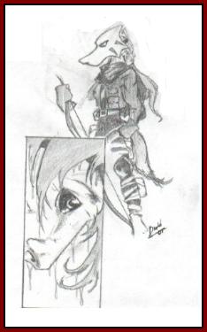 Appearance: Black cargo-style trousers, black shirt, black jacket, fingerless black leather gloves, and a short black cloak. He carries numerous pouches along with pockets either natural to his clothing or added to them. His brown hair falls below his shoulders. He has a tail and canid ears, but is not a full lycanthrope. He wears a faceplate that hinges on a padded iron strap that fits around his head, the 'mask' of which is crafted from tin and shaped into a wolf's face.