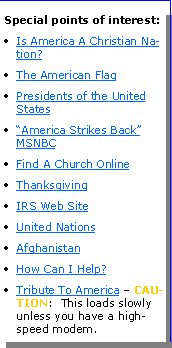 This is a sight that honors our country, the United States of America. I am proud to be an American and enjoy its freedoms, and its opportunities.I have accumulated some links to the left that I hope will be of interest and help to you.My main web site is at First Baptist Church of Harrison.