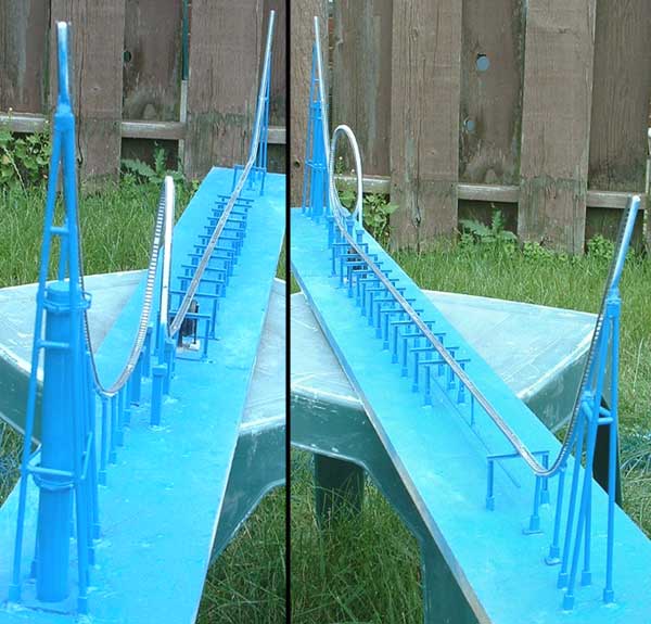 6/20/02 Two views, each from a spike. The track is complete and will be painted a light blue next. The board will soon have sand and queue theming. The loop's vertical supports are now in place, as is the pulley return channel.