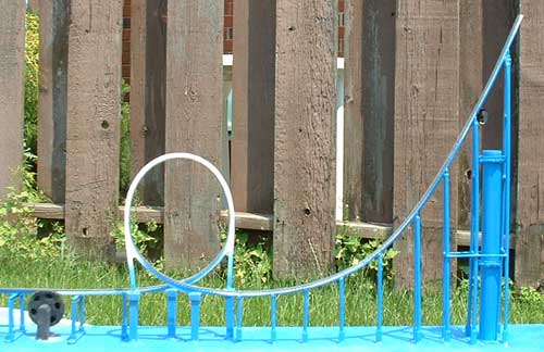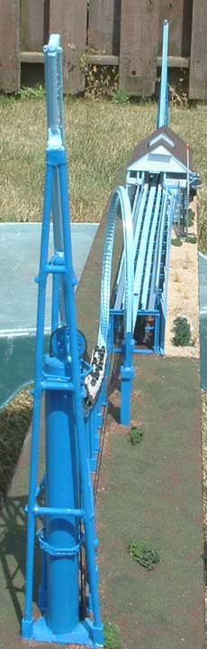 6/12/02: A profile of the entire model, along with some inspiration! At this point the launch area had been painted, but supports were still under way for both spikes. The train is coupled together but awaits paint. Once cut down, the tower will stand as tall as the loop.