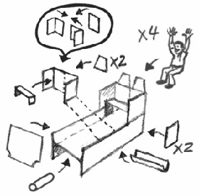 A diagram of the train assembly. Each of the 7 cars are made from no less than 22 pieces and is 3/4" long! These are all styrene pieces cut by hand, except for the horizontal I-beam used for the flooring. The seatbacks and sides had to be made out of 2 L-strips because the U channels available from Evergreen weren't wide enough. Right, the entire train awaits headrests and couplers. The lead car's nose is shaped basswood. The cars are connected by a leather cord, which is flexible, but rigid enough to allow the train to be pushed.