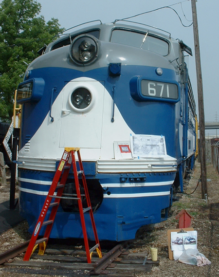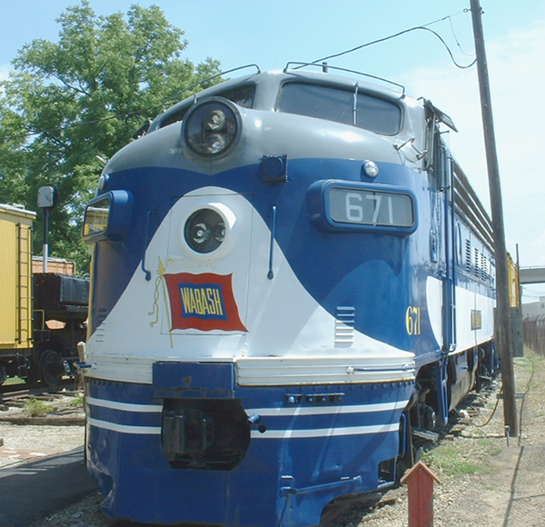1996 saw a repaint minus the details. In 2005 I volunteered to add the Wabash flag and lettering back on the F7. Since it is right by the crossing, I wanted it to look good! Here are a few shots, showing the loco before and after.