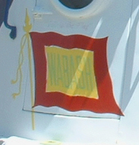 The flag was challenging since there are few straight lines. The museum had a 1:1 xerox of the paint diagram so I taped that up and used a sharpie to mark edges. This is a good technique as long as the paint will cover it up! The letters were made by first putting yellow on, then marking all the letter edges. 1/2" painters tape was applied, carefully following the marks. After the blue was dry the tape was peeled away. The xacto was used to keep the paint from coming up.