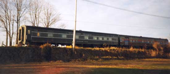 I helped restore the exterior signs for this New York Central coach, which used to run on the Empire State Express. Dennis Shroyer of Wapakoneta, OH, owns this car, as well as an Amtrak baggage car and some misc. equipment. If you are traveling on Route 33, you will pass the car just east of the Interstate 75 bridge. You can access the site through an adjacent road that takes you through a trailer park. The cars are sitting on a former NYC line that ran to Bellefontaine. Now it is history, and the track used for this display had to be hand-layed.