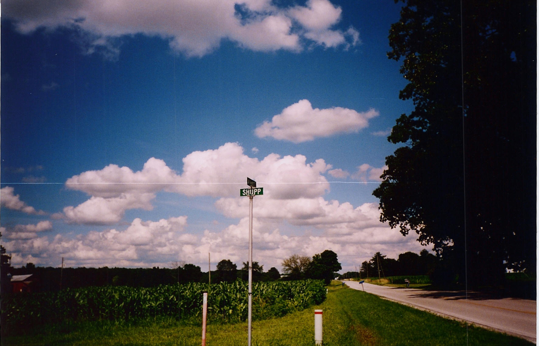 Standard Crawford County signage at Shoop (township road) and Wyandot (county road) Roads - Shoop Rd. is Bucyrus Township Road 214, and Wyandot Rd. is Crawford CR 12. The intersection is southwest of Bucyrus. Wyandot Rd.'s sign is exactly like Shoop's. Picture taken by James Schul on July 12, 2003. Thank you! |