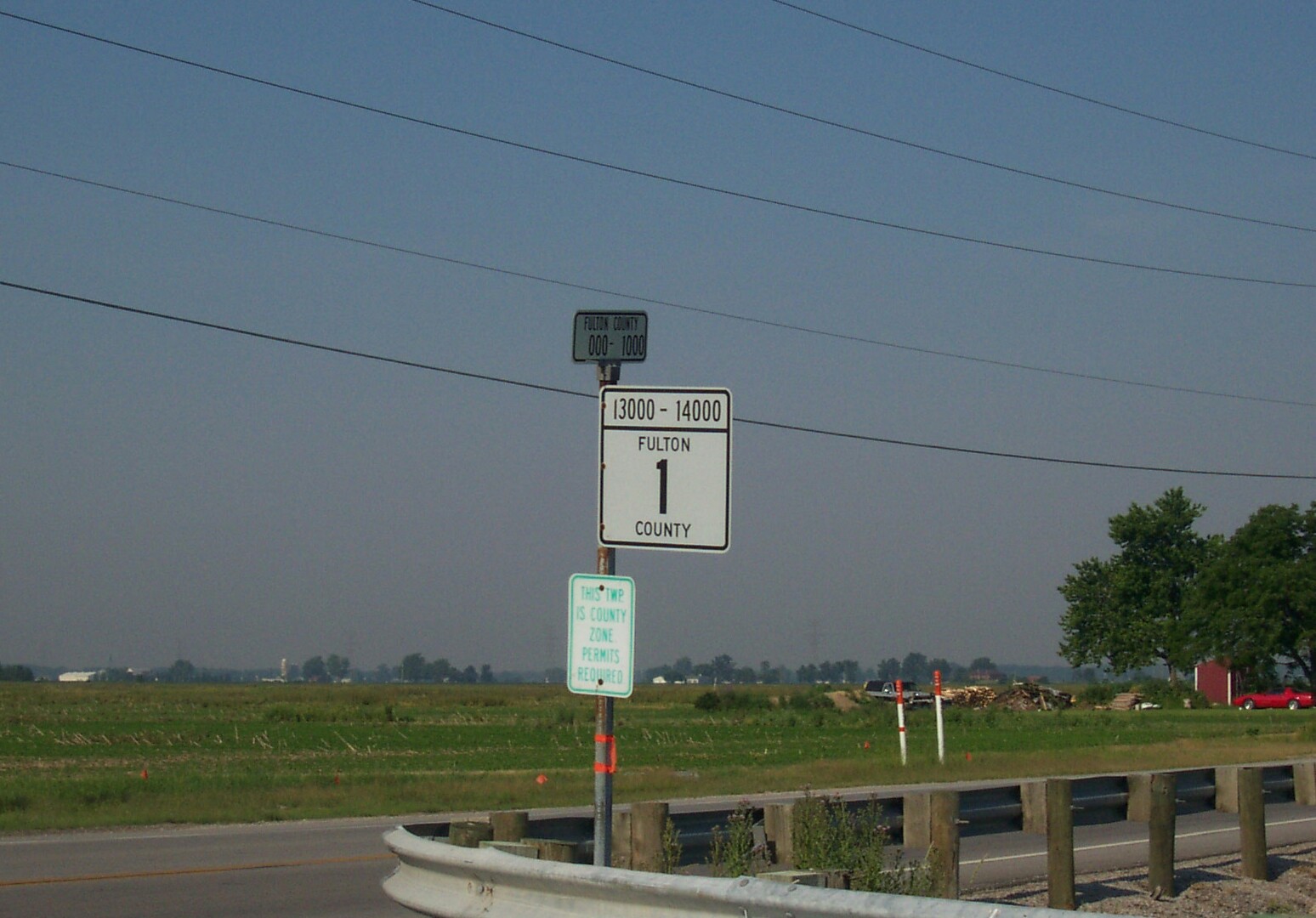 At the corner of Fulton-Lucas Road (or County Road 1 in Fulton County) and US-20/OH-120 sits this sign. Fulton County uses a county road system with numbers running north/south and letters running east/west. The block number is shown on both signs here, the top sign noting block numbers on 20/120. Picture taken June 25, 2003. |