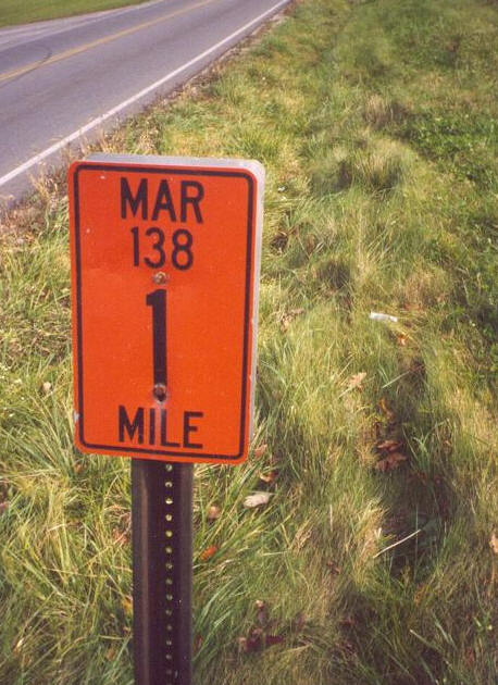 This is the type of milemarker found on Marion County's county road system. This is on Barks Road, or CR 138, between S. Prospect St. (OH 4) and Delaware Ave. (OH 423) on the south side of Marion. Taken 10/18/03 by James Schul. Thank you! |