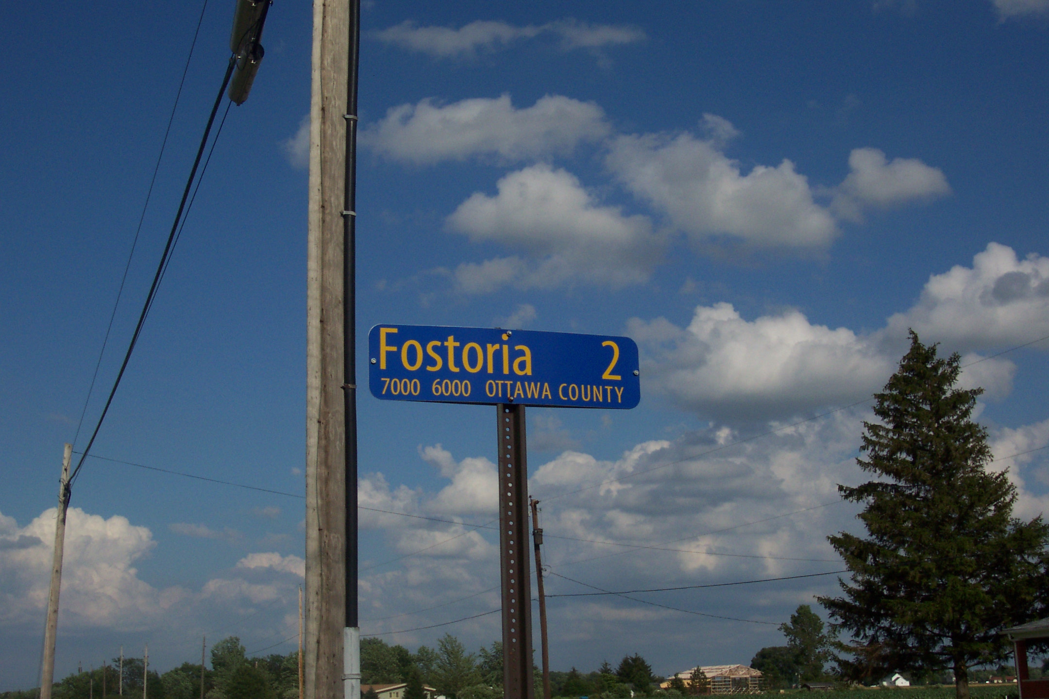 Taking a right turn off Curtice Road onto Fostoria Road, this is the first sign you encounter. Although Fostoria Road is located on the Wood/Ottawa County Line, Ottawa County maintains this road, as noted by the middle sign. The lower sign notes the county road number for Fostoria Road. Ottawa County uses a standard pentagonal county road marker, used in other counties in Ohio. Picture taken July 5, 2003. |