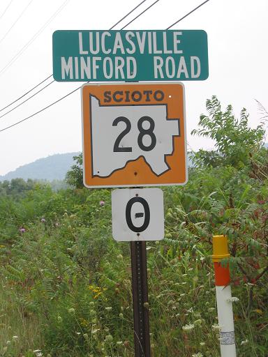 Nice example of a Scioto County route sign, city of Lucasville. This was taken right in front of the Southern Ohio Correctional Facility, where the nation's longest prison uprising occurred in 1993. Thanks to James Moyer for taking this picture. |