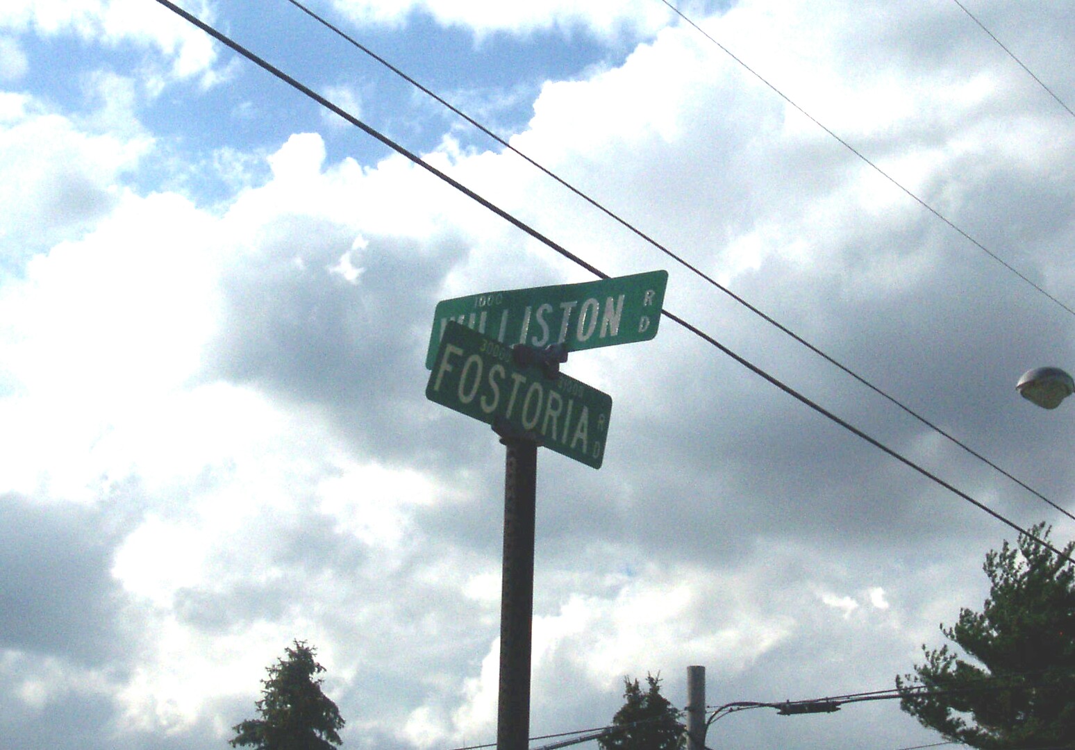 This is a slightly banged-up street indentifer sign located at the the corner of Williston and Fostoria Roads at the extreme NE corner of Wood County. Note the use of block numbers on each sign blade. This is standard on Wood County street signs. Picture taken July 5, 2003. |