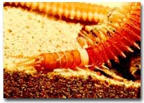 Segmented worms make up the Phylum Annelida. The phylum includes earthworms and their relatives, leeches, and a large number of mostly marine worms known as polychaetes. Various species of polychaete are known as lugworms, clam worms, bristleworms, fire worms, and sea mice. Annelids can be told by their segmented bodies. Polychaetes (meaning "many bristles") have, predictably, many bristles on the body, while earthworms and leeches have fewer bristles. There are about 9000 species of annelid known today.All members of the group are to some extent segmented, in other words, made up of segments that are formed by subdivisions that partially transect the body cavity. Segmentation is also called metamerism. Segments each contain elements of such body systems as circulatory, nervous, and excretory tracts. Metamerism increases the efficiency of body movement by allowing the effect of muscle contraction to be extremely localized, and it makes possible the development of greater complexity in general body organization.Besides being segmented, the body wall of annelids is characterized by being made up of both circular and longitudinal muscle fibers surrounded by a moist, acellular cuticle that is secreted by an epidermal epithelium. All annelids except leeches also have chitonous hair-like structures, called setae, projecting from their cuticle. Sometimes the setae are located on paddle-like appendages called parapodia. Annelids are schizocoelous and with a large and well-developed true coelom.The internal organs of annelids are well developed. They include a closed, segmentally-arranged circulatory system. The digestive system is a complete tube with mouth and anus. Gases are exchanged through the skin, or sometimes through specialized gills or modified parapodia. Each segment typically contains a pair of nephridia. The nervous system includes a pair of cephalic ganglia attached to double nerve cords that run the length of the animal along the ventral body wall, with ganglia and branches in each segment. Annelids have some combination of tactile organs, chemoreceptors, balance receptors, and photoreceptors; some forms have fairly well developed eyes, including lenses.