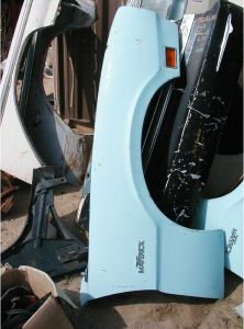 | Here are a couple pictures of parts I have found along the way to being finished. Here is a set of fenders that I had bought off of Ebay. They are rust free and no dents! I paid 177.00 Plus 60.00 shipping! Doesn't sound like to big of deal until you find out that fiberglass replacements (which is the only thing available now) cost about 268.00 a piece! Ebay is the best source for used parts, that and the junk yard. |