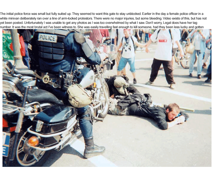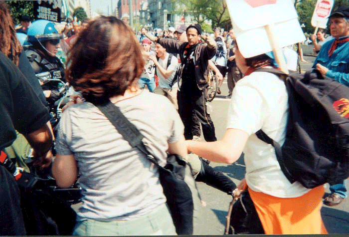 New!!!Police blocking videographer access during A16 DC WTO/IMF Protests Video from DC Indymedia on a recent Reclaim the Streets in DC Coffee Shop Scuffle Coffee shop worker attacked by police at Reclaim the Streets Reclaim the Streets More video is available at DC IndymediaScroll down and look at their main articles section. There's no other major brutality stuff, but it's good to know they're keeping the cameras warm over there! New!!! Breaching the Wall of Shame in Quebec New!!! Tear gas and rubber bullets in Quebec City New!!! Jello Biafra Speaks in Quebec City More Video A16 Video a16 Music Video by Independent Media Center A17 Camera Pepper Sprayed (Link restored!!!!!) by IMC/Rick Rowley 9:06am Mon Apr 17 '00 brief clip of video camera getting pepper sprayed Footage of Arrest of Girl by Plain Clothes Cops(Link restored!!!!!) She's being dragged though the streets Art in D.C. part 1 Two people shooting some scenes at A16. In the middle we find out why a older businessman would leave his office and sit in with the protesters in suit and tie. Unarrest, Freedom Plaza (at Inaugeration Protests) by Brian Long 10:44am Mon Jan 22 '01 (Modified on 11:02am Fri Jan 26 '01) b.long@hushmail.com b.long@hushmail.com At approximately 2:30 at Freedom Plaza, 4 individuals identifying themselves only as 'Police' dragged a protester through the plaza. Through the quick intervention of other protesters, both black block and other, the protester was unarrested. However, the protester did not get away before being dragged bodily from near the bleachers nearly to the street at the back of the Plaza. New!!!Harassed by Undercover cops? Here's what one lady does about these jackasses (he, he) New!!!More comedy- Assistant DC Police Chief Pepper Sprays Himself