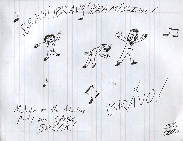 Behind the scenes: "ˇBravo! ˇBravo! ˇBramíssimo!" comes from the musical "Once Upon a Mattress," which was being prepared at the time as the school's spring show. Although I do believe the spelling is "Bravíssimo," which would make a lot more sense. I likely wasn't thinking again, which is nothing new for me. Dumb Josh, bad.