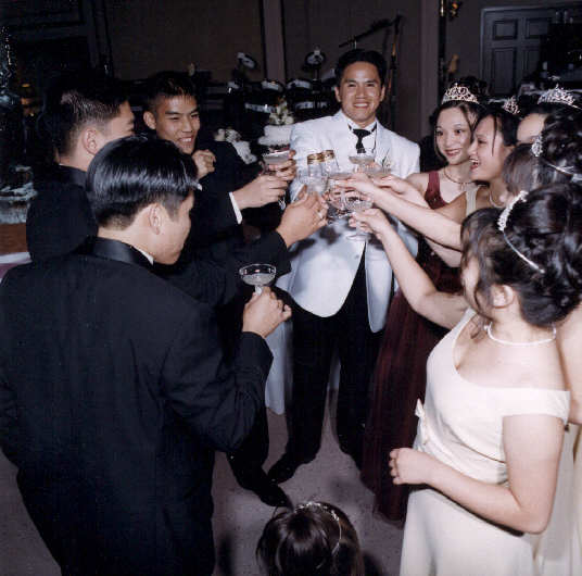 Bottom Row: pouring the champagne, toasting each other, drink up, the bridal party toasts the new couple