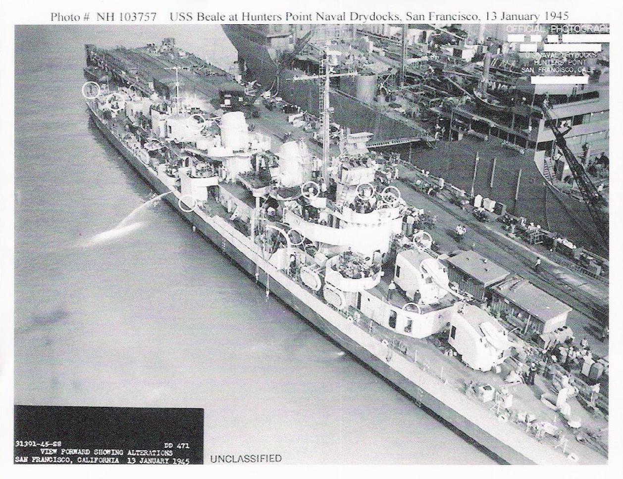 In April-June 1945, following overhaul at San Francisco, California, Beale took part in the assault on Okinawa and the associated lengthy struggle against Japanese suicide planes. Though at times closely engaged by attacking Kamikazes she emerged undamaged and, in July, was employed on anti-shipping sweeps off China. Between mid-September and mid-November 1945 Beale supported the occupation of Japan, then steamed to the United States. Returning to the Atlantic in December, she was decommissioned in April 1946 and placed in the Reserve Fleet.