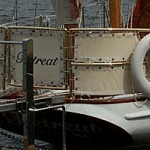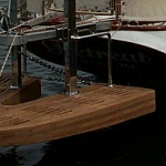 This solid teak platform was added to the stern for camermen and additional stunts. A great deal of money was put on to this boat, only to be removed later because these extra additions would serve no purpose to the original owner of the boat. This platform is also much to heavy for the balast of the boat while sailing. |