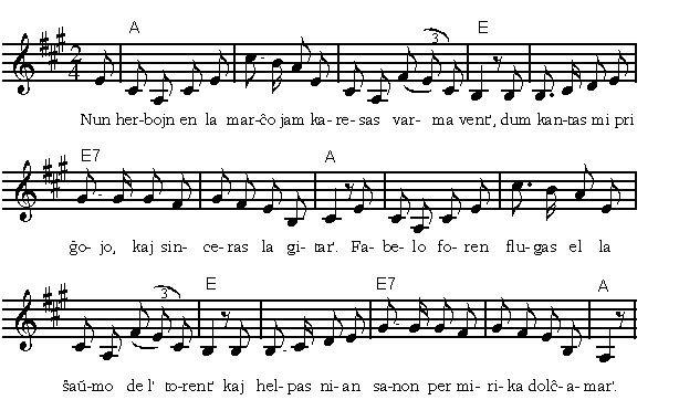 Nun herbojn en la marĉo jam karesas varma vent'