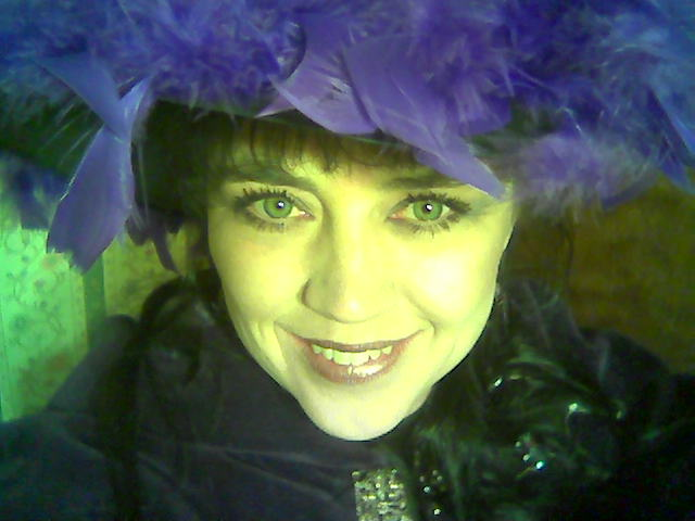 My hat had purple feathers on it, and I wore a long black dress,