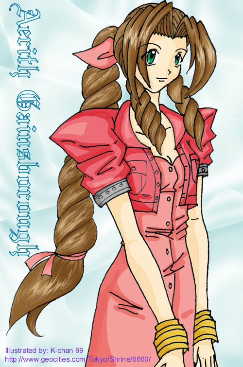 | Aerith Gainsborough | Uploaded: 11 July 1999 RPG: Final Fantasy VII Comments: Aerith is one character I don't really like...Why did I draw her? Well, it was for fun and I didn't know it'll turn out nice^^;; Oh well...I hope you like my little piece of artwork. |