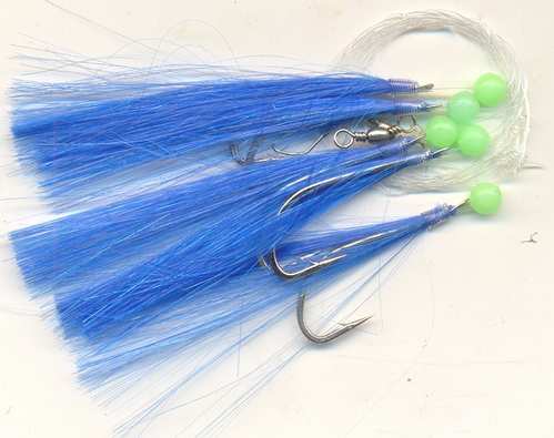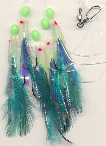 Blue Lightning A striking feather trace rig, nice blue with shimmer sheen Each trace has 5 size 3/0 hooks, on strong 30lb+ mono, with swivel clips at each end. Price - per 5 packs £4.50 |