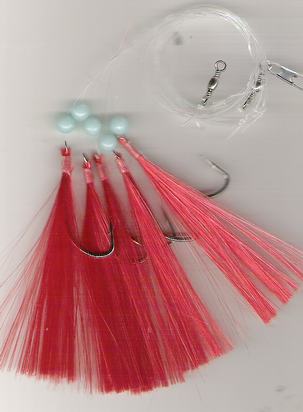 Red Lightning A striking feather trace rig, nice red with shimmer sheen Each trace has 5 size 3/0 hooks, on strong 30lb+ mono, with swivel clips at each end. Price per 5 packs £4.50 |