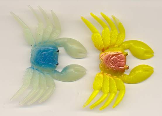 Plastic Latex Crab, quite good to keep in the tackle box, for those occasions, of clear water, when fish are tight to the bottom, and a little enticement is needed. Again have the correct rigging hooks available, so these baits can be lifted and dropped, so the crab stays in a horizontal position. Price for 10 of either pattern - £2.99 |