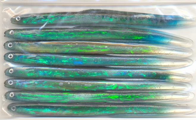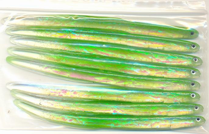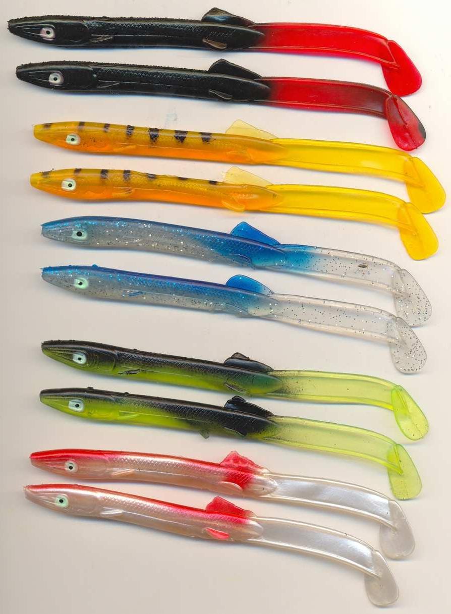 On offer, packs of sand eels, there are 5 in each colour pattern, Length 6 inch. Superb effect in water with the wobble tail. tunnel thru eel to thread line - hooks, beads etc.
