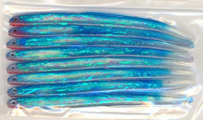 Beautiful blue coloured sand eel imitations. All 4 types have a great holographic foil inside the fish, which produces an excellent effect down the length of the eel. The blue eel also has a great red throat. Price per pack 8 - £4.99 |