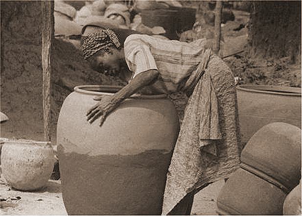Mothers and Daughters. Dada Compound begins with a fascinating account of the meaning of decoration on Yoruba ritual vessels commonly used prior to the arrival of Islam in Nigeria. Students of archaeology in particular will be humbled by the complexity of beliefs about particular motifs on vessels that formerly were essential for every household. Every viewer will be interested in the particular beliefs regarding the proper production and use of these vessels. The main theme of the video, however, is the production of large water jars, an essential item for every household in the area. An issue of great interest is the social organization of production, including collaboration among women. Viewers learn about the distinctive roles of men as well as women in different steps of production. They cannot help but be impressed with the strength, technical knowledge, and stamina required to produce effective vessels using hump molds and to successfully fire them on a large scale.