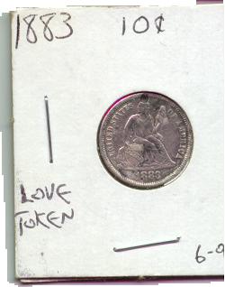 found this one at a site near the S.J. airport. this coin has been altered on the back side, making it a "love token" the obverse has someone's initials etched into it. these were made for a person to give another that he/she loved. found another 1883 love token on 4/7/01. its at the bottom of page