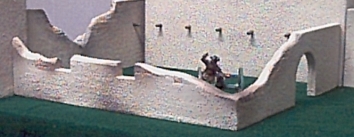 This corner unit is designed to slide against the rear wall of the convent and the chapel. It measures 13.5”x13"x4” high. It has an archway that leads to the corral area and there is an earth covered gun ramp in the corner which is raised about .5”. The model is painted as shown and there are exposed adobe bricks near the damaged area that are finished in contrasting colors. Order P141 $65.00 Correl Wall Section This model is designed to slide against the Courtyard wall section or can be used directly behind the convent if space is a concern. It measures 10”x13.5”x1.5” high. It comes completely painted as shown in the picture and includes the earth gun ramp Order P142 $40.00 Links Page 1 Page 2 Page 4 Page 5 Page 6 Page 7 Page 8 To order Home Page |