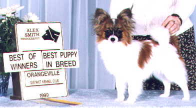 "Bandit" is owned by my friend Ricki who is actively involved in competing with her Papillons in the Obedience ring. As Bandit is another one of our home-bred puppies and a littermate to our Canadian Champion "Donant's Cinnamon", we were all thrilled to learn that Bandit has obtained several High in Trials and will work for his UDX 2004. He is an awesome, very athletic boy with the sweetest personality. Thank you Ricki for doing such a wonderful job with Bandit.