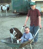 This red and white slick haired male is out of 'Brite' and by 'Willy'. Due to an accident when working pairs, he is able to help, when needed, around the corrals. He will still bite a nose, front foot and a heel when he needs to. He is a very stout dog, even for being crippled. He is generally used to get any puppies hooked onto working stock. He's the dog that you can lay down and not worry about him getting up when you work a pup/young dog over the top of him. He is produces very well. As you can see above, he makes a pretty good babysitter!