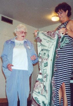 The oldest graduate present, Luella Tibbitts Roady, Class of 1929, being presented a Crescent Afghan.
