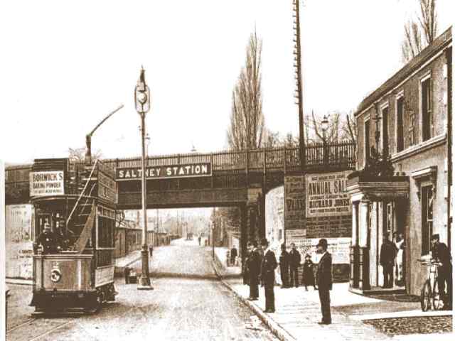 ELECTRIC TRAMCAR, Saltney, 1905. This was the terminus of the line which went through Bough Green, over the Grosvenor Bridge, along Bridge Street, Eastgate and Foregate Street to the station. The trains were electrified in 1903, the Corporation having decided to take over the Chester Tramways Company the previous year and replace the 20 year old horse trams with twelve small, doubledeck, open top, electric vehicles in apple green and ivory. Five more were added in 1906. To cope with Chester's narrow streets, the small gauge of 3ft. 6in. was adopted and the trains remained in service, with an extension from Boughton to Christleton and Tarvin Roads, until 1930. The rails were then covered over but were not removed until 1946-47. There was chaos caused by digging up the tracks and relaying the streets with tarmac. The wooden blocks had replaced the original granite setts many years before, presumably for quietness, and these were sold off by the Corporation after they had been dug up. In the freezing winter of 1947 they provided a wonderful addition to the meagre coal ration of those immediate post-war years. In this photograph, Saltney Station is very prominent. It cost 4d. single and 7d. return to the General Station by train ( but only 2d. on the tram). Richard Jones' Sale started on 7th January, 1905, it says on the poster by the hotel - now called the First (or the Last - depending on your direction of travel ) House in England. Notice the news agents - still in business - who were also the sub-post office at that time. A nonchalant postman is leaning on his bike and there are the usual bystanders including maids from the hotel. Notice the tiny boy by the lamp standard with a hand cart. Children were smaller in those days and they left school at 12.