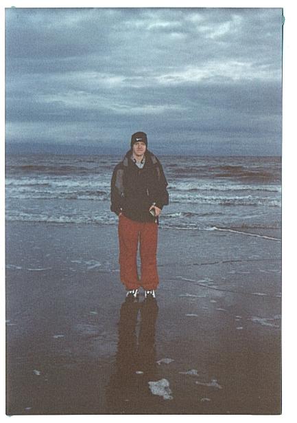 This is me on the beach out in Campbell River. It was kinda chilly that day & I was on my way to see another cousin I hadn't seen in 13 years. I'm really tired in this pic because all of us had just finished skiing on Mount Washington. It's on Vancouver Island. IT WAS SWEET!!!! Just after this picture was taken, the wave behind me crept all the way up and nearly went up to my ankles.