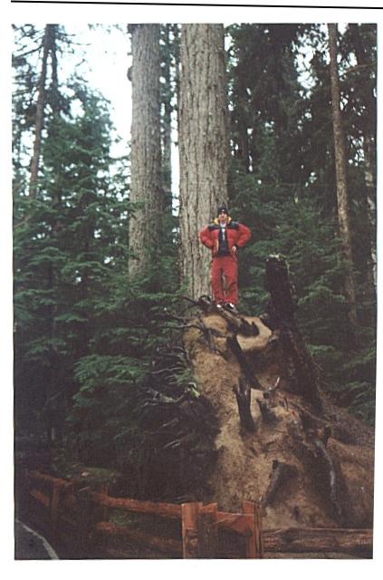 This tree had fallen over during an incredible wind storm. I'm standing on one side of the base of the tree. It stretches about 480 feet to my left on the ground. If you look to the bottom left of the picture you'll see a walkway has been put there and the railing is just at my waist when I'm standing on the ground. So, you can see how big the tree is compared to me. I'm about 30 feet up! The place that I am in is called Cathedral Grove & this is the place where some of the biggest trees in Canada grow. It's now a protected park & these trees will never be logged (cut down).