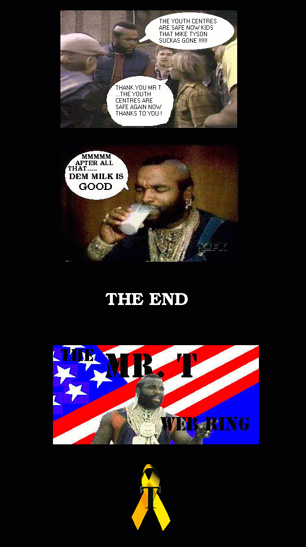 THIS PAGE IS DEDICATED TO A GREAT HELLUVA TOUGH MAN MR T WHO IN THE 80S BECAME A 10 YEAR OLDS HERO HE WAS HARD ON PUNKS BUT SOFT ON KIDS AND GOOD TO HIS MOTHER. MR T IS TRULY THE BEST. WE ALL WANT TO SAY MR T WE LOVE YOU!! YOU ARE HELLUVA BRILL..