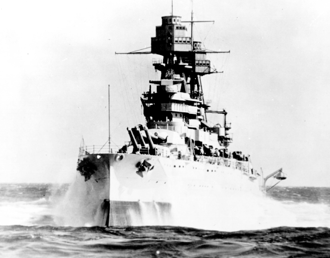 Arizona was moored in Pearl Harbor's "Battleship Row" on the morning of 7 December 1941, when Imperial Naval Forces of Japan attacked. The Arizona was the most heavily damaged of all the vessels in Battleship Row, suffering three near misses. But the fourth was an 800-kg bomb dropped by a high-altitude Kate bomber. That bomb struck her starboard of turret two and then penetrated her armor deck. It detonated below decks within a 14-inch powder magazine. The resulting massive explosion broke the ship in two forward of turret one; this collapsed her forecastle decks which then created such a cavity that her forward turrets and conning tower fell thirty feet into her hull. The Arizona was a total loss.