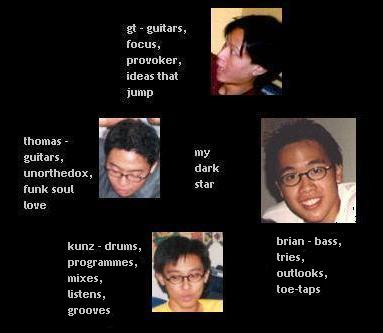liver.mp3 - my dark star shahrul - vox gt - words, guitars, programming thomas - wurlitzer patch, guitars, solo brian - bass kunz - recording, post production, making it fall in place we've been rehearsing these four songs and working titles : egyption sounding song : we got this one written in one day, and we've been practicing it. it probably sounds pseudoly middle eastern. it's pretty driving and gives me cramps when i play bass. thomas and gt do a take on vocal harmoney for this one penetrate : thomas wrote this song, and i think we have a good final version of wot we want it to sound like. interesting arrangement too. overkill : i really love the introduction for this one. originally, gt used an ebow to play something very dissonant, and kunz backs him up with a strong, steady drum take. after two bars, thomas and i come in really strong. my bass is droning while thomas cranks up the rhythem work. gt plays some delay-ish single notes that really add an edge. the breakdown is also super melodic. new technology : a pretty old song. but still, i reckon it sounds great live and we enjoy playing it. a gt number, and it really shows. kunz does tippy beats for this, and it was going thru a phase where we wondered if we could do some fusion dance thing. it dosent sound so electronic, and i think it makes an interesting rock song. |