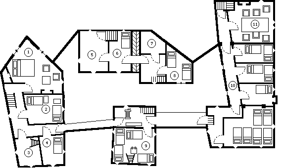 10 Entrance to the bedrooms. All cost about the same per room, so the smaller rooms are more exclusive and better fitted. The door at the southern end of the hall is usually kept barred. All doors on this floor are locked, with paying guests getting keys to the hall doors and their room.